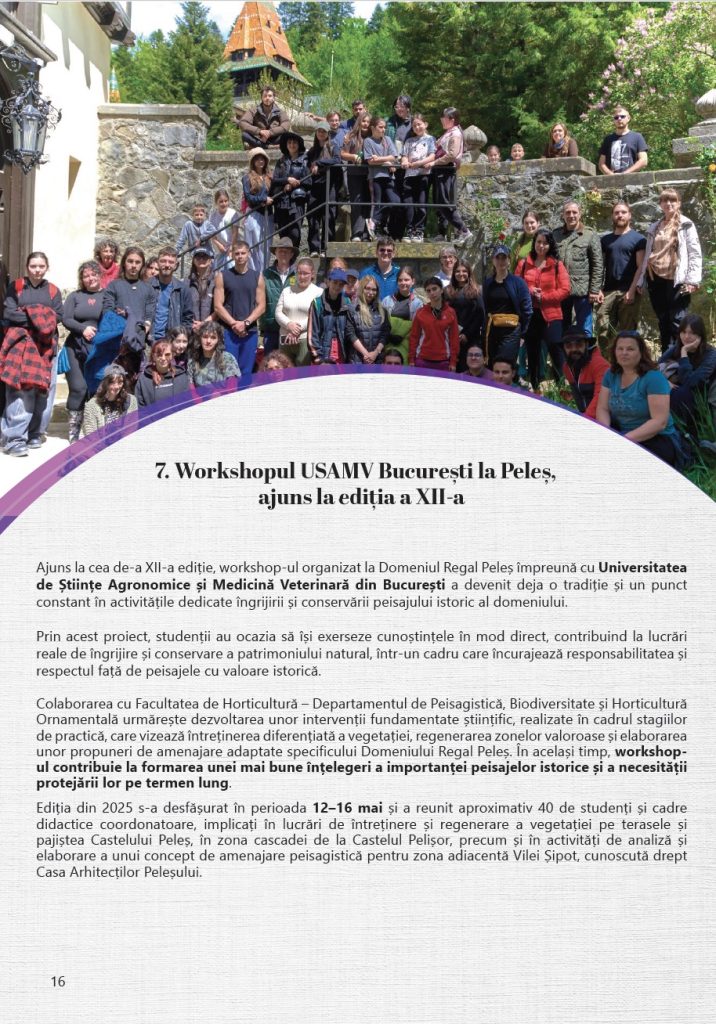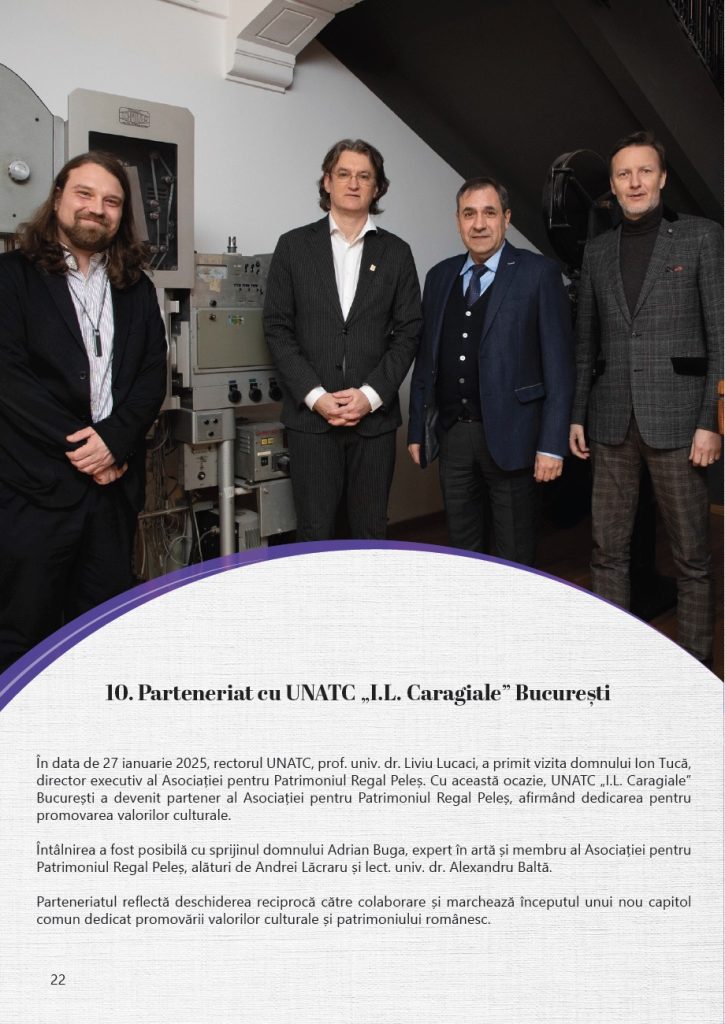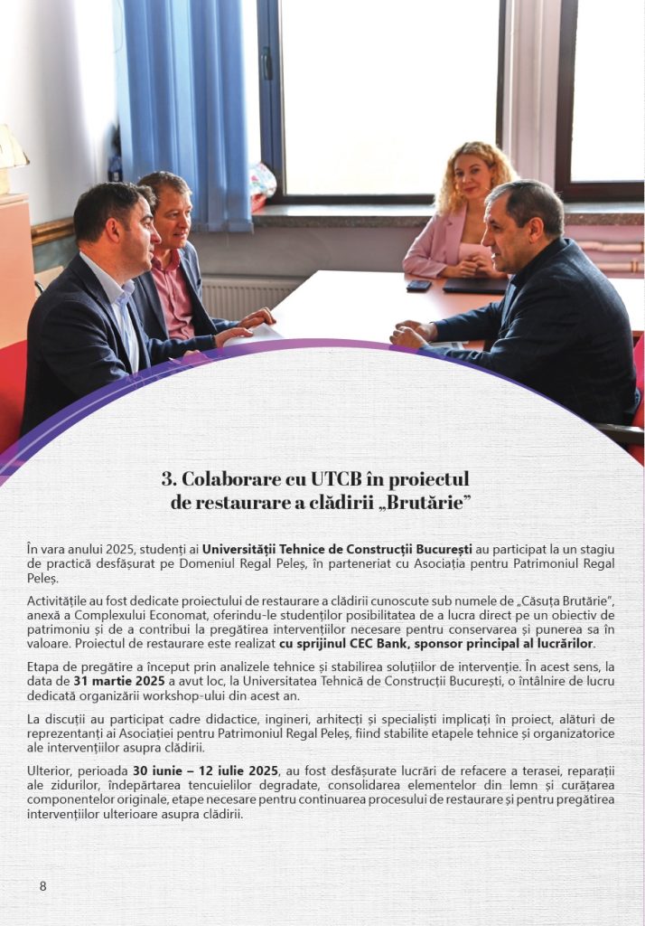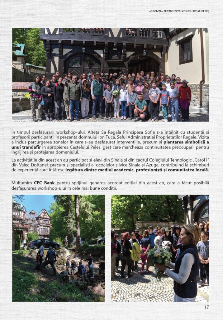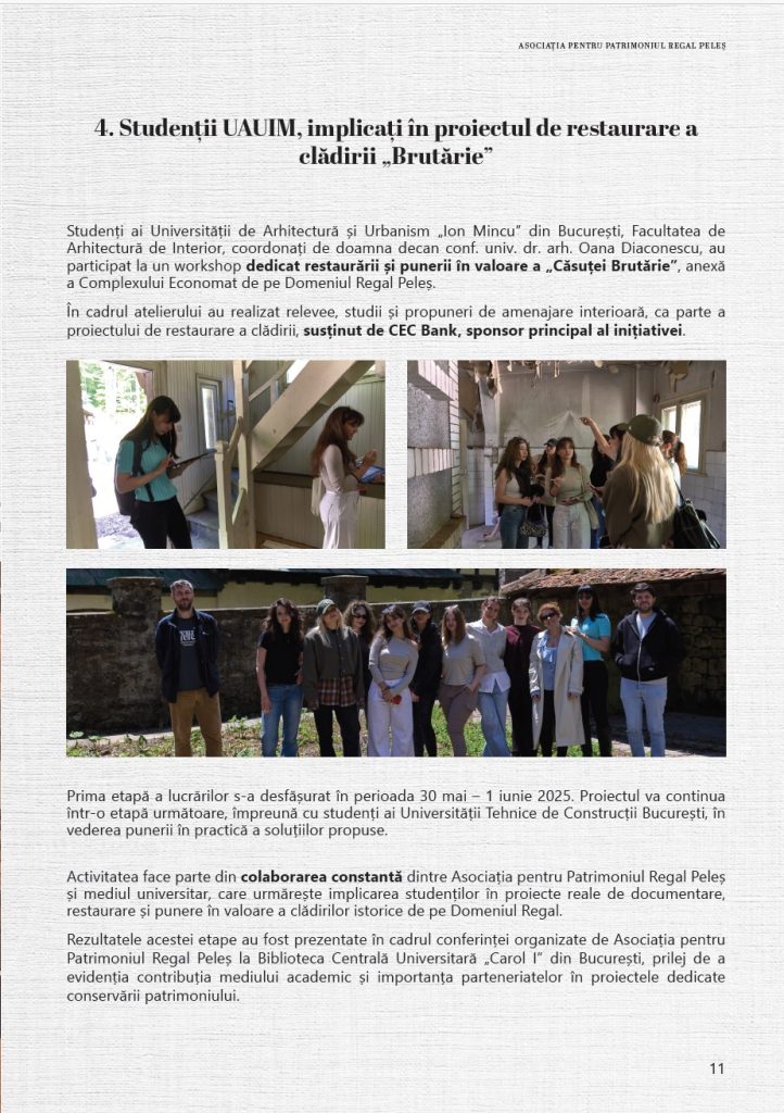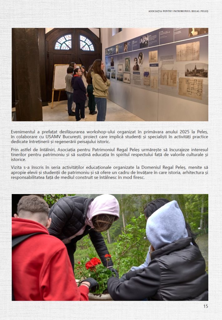 Anul 2025 a continuat direcția proiectelor dedicate protejării și punerii în valoare a patrimoniului Domeniului Regal Peleș, prin colaborări cu instituții academice, parteneri din mediul privat și specialiști implicați în conservarea patrimoniului cultural. Activitatea Asociației a urmărit, și în acest an, susținerea unor demersuri concrete menite să contribuie la păstrarea acestui loc de referință pentru patrimoniul românesc și la transmiterea sa în bune condiții către generațiile viitoare, într-un context cu o semnificație, marcat de împlinirea a 150 de ani de la punerea pietrei de temelie a Castelului Peleș, un reper important în istoria Domeniului Regal și a patrimoniului românesc.