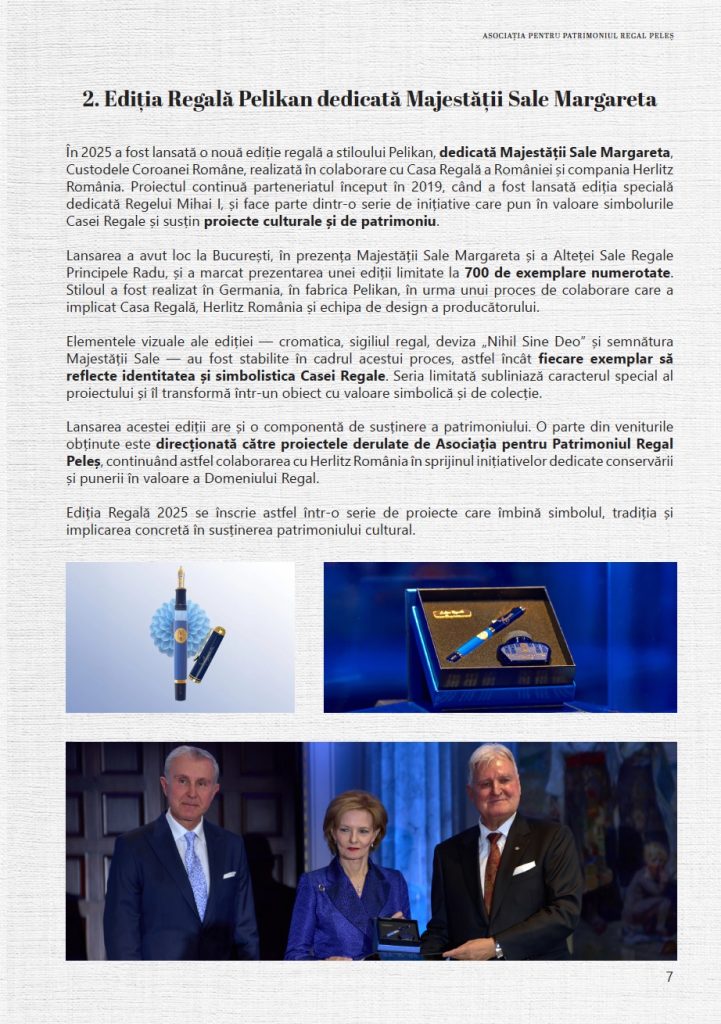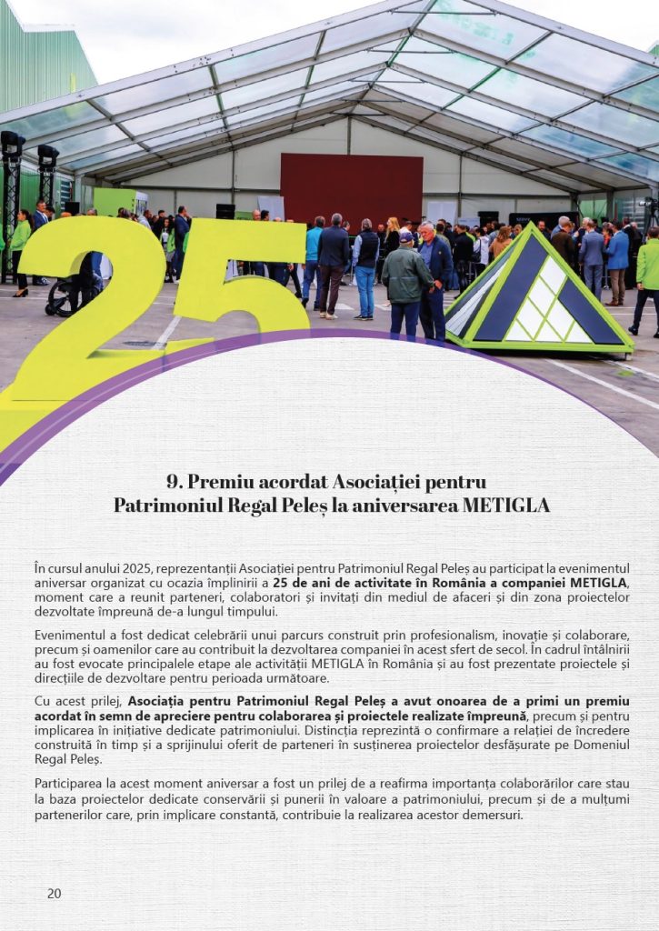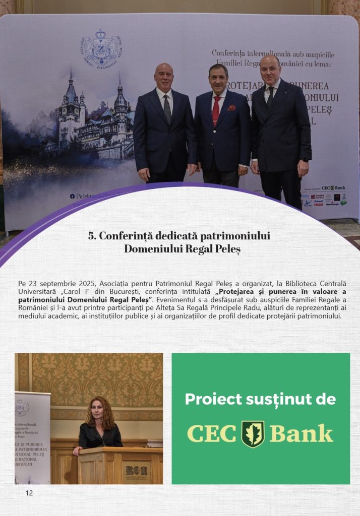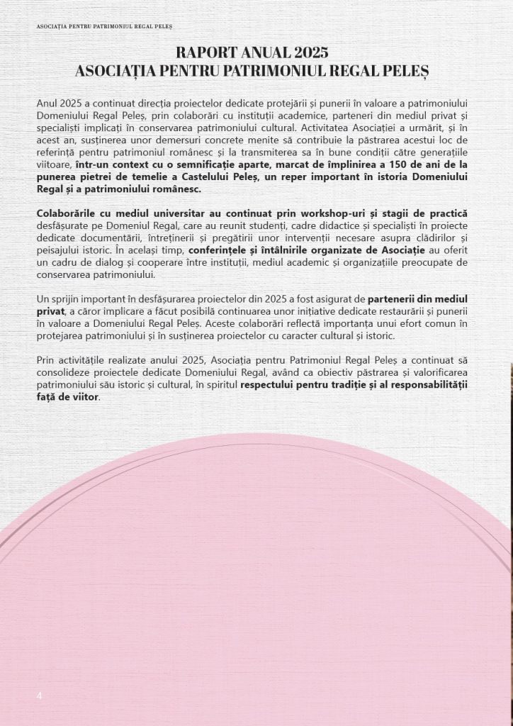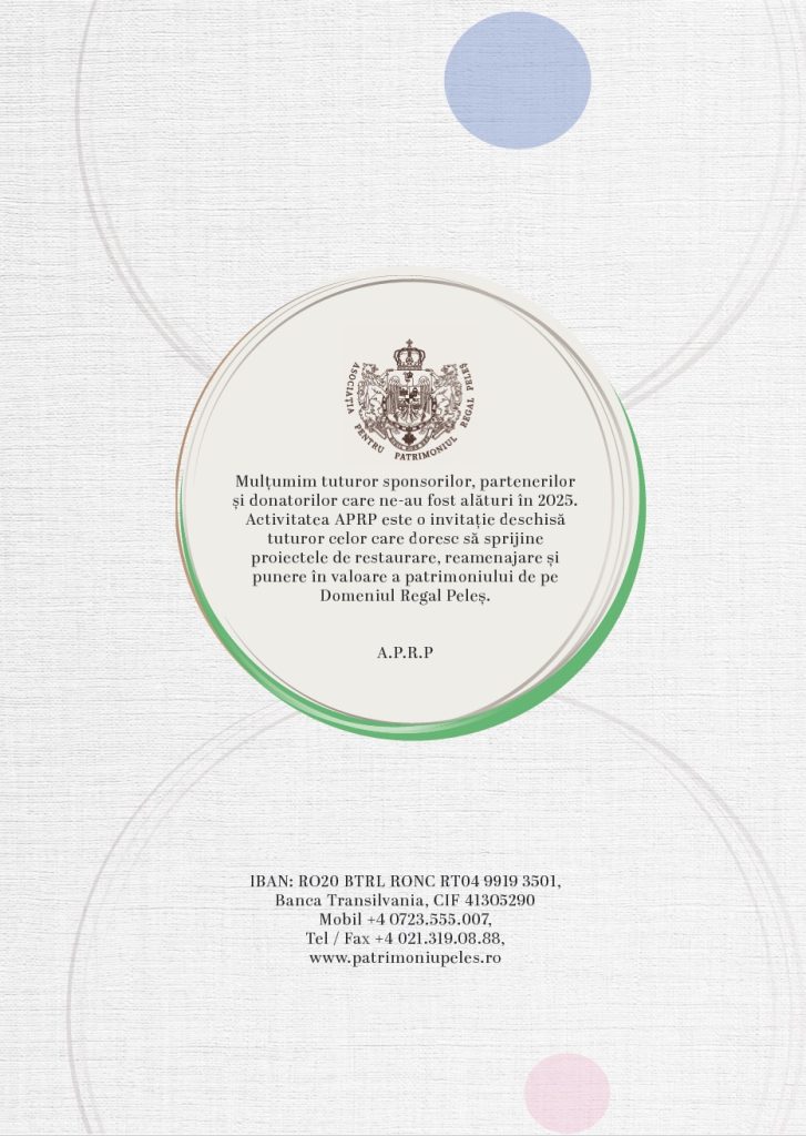 Prin activitățile realizate anului 2025, Asociația pentru Patrimoniul Regal Peleș a continuat să consolideze proiectele dedicate Domeniului Regal, având ca obiectiv păstrarea și valorificarea patrimoniului său istoric și cultural, în spiritul respectului pentru tradiție și al responsabilității față de viitor.