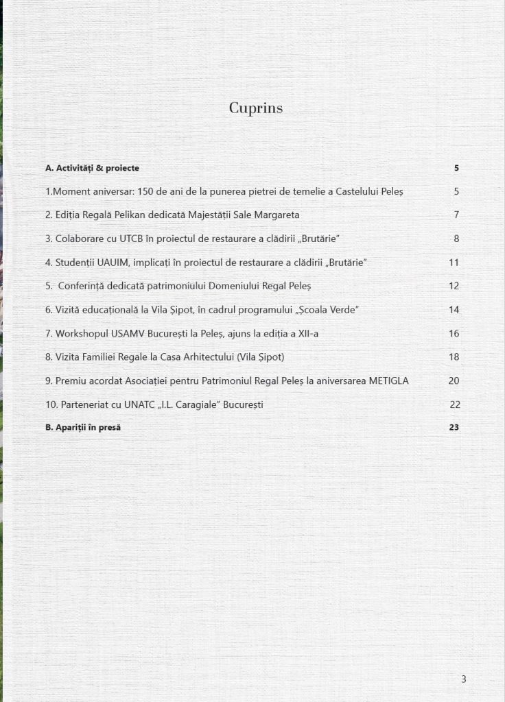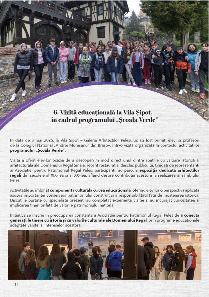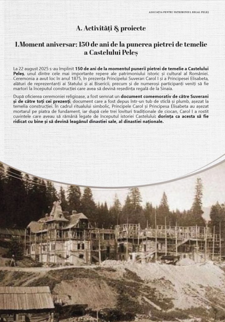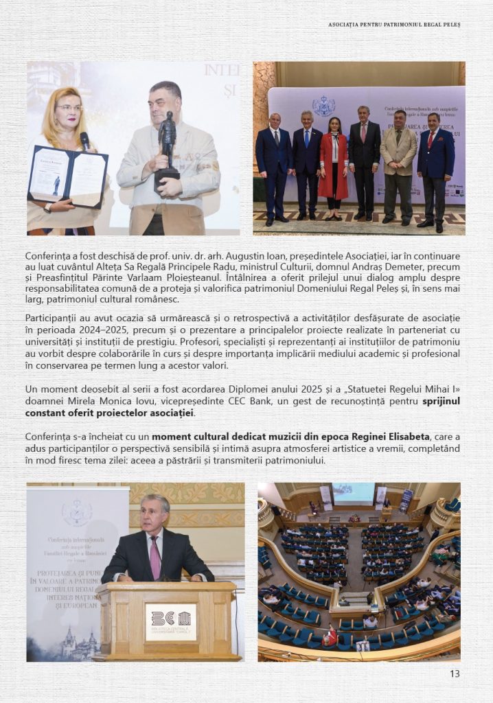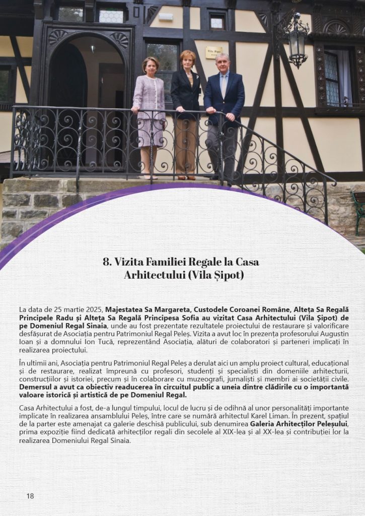 Prin activitățile realizate anului 2025, Asociația pentru Patrimoniul Regal Peleș a continuat să consolideze proiectele dedicate Domeniului Regal, având ca obiectiv păstrarea și valorificarea patrimoniului său istoric și cultural, în spiritul respectului pentru tradiție și al responsabilității față de viitor.